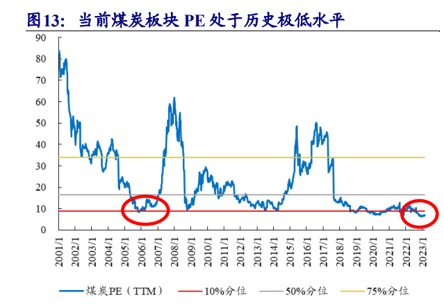 煤炭板块 PE 处于历史极低位。截至 2023 年 3 月 10 日,煤炭板块市盈率 PE (TTM)为 6.70 倍,远低于历史估值 10%分位。历史上,煤炭板块 PE 低位出现在 2005 年,2008 年,2014 年及 2020 年。2005 年 12 月,煤炭板块 PE 阶段性低点为 8.35 倍,比当前 PE 高 24.6%。2008 年 10 月,煤炭板块 PE 阶段性低点为 9.41 倍, 比当期 PE 高 40.4%。2014 年 3 月,煤炭板块 PE 阶段性低点为 9.07 倍,比当期 PE 高 35.4%。2020 年 3 月 23 日,煤炭板块 PE 阶段性低点为 7.09 倍,比当期 PE 高 5.8%。从基本面看,2005 年煤炭行业盈利向好,煤价经历 2004 年的上涨后维持高 位,PE 低位主因股市整体低迷;2014 年煤炭供给严重过剩,煤企利润大幅下滑, 亏损面扩大,盈利下降导致 PE 低位;2020 年疫情突发,股市大幅波动,煤炭板块 出现 PE 低点。从历史 PE 看,2005 年、2008 年、2013-2014 年、2020 年,煤炭板 块 PE 都出现相对低点,2008 年主因金融危机,股市出现大幅波动,2013 年-2014 年煤炭行业进入低谷,低盈利导致低 PE,2020 年主因突发疫情,能源价格出现大 跌。但相比于行业低谷于突发事件期间,当前煤炭板块高盈利、低 PE,基本面更 接近于 2005 年的高盈利时期,但 PE 仍远低于当时低点。当前煤炭板块 PE 已处于 历史区间谷底,主因 2021 年以来煤炭板块业绩持续增长,而煤炭板块价值被严重 低估。
