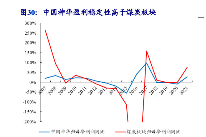 2020 年以前,中国神华估值始终低于煤炭板块。中国神华以煤炭产品为基础, 形成了煤炭“生产——运输(铁路、 港口、 航运)——转化(发电及煤化工)”一 体化运营模式,具有链条完整、协同高效、安全稳定、低成本运营优势。中国神华 体量较大,受益于“煤电路港航化”一体化经营模式,中国神华经营稳健性高于行业, 业绩相对稳定。从 2010-2020 年煤炭行业和中国神华的估值对比中可以看出,中国 神华 PE 始终低于整个煤炭板块,部分年份弹性远不及整个板块,盈利相对稳定反 而不具有强周期性,几轮周期中,中国神华弹性较弱,并不是煤炭板块优选标的。