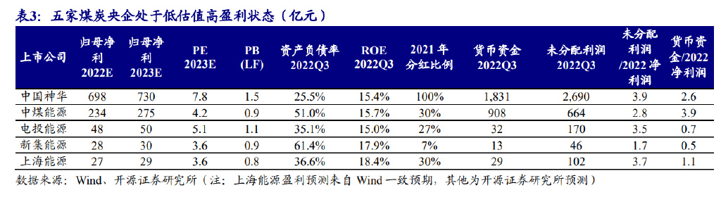 五家煤炭央企具备提估值基础。煤炭行业共有五家央企,分别为中国神华(隶 属国家能源投资集团)、中煤能源(隶属中煤能源集团)、电投能源(隶属国家电力 投资集团)、新集能源(隶属中煤能源集团)和上海能源(隶属中煤能源集团)。五 家煤炭央企中,除中国神华估值相对更高外,其他估值普遍较低,中煤能源集团旗 下三家上市公司市净率均处于破净状态。从净资产收益率看,五家煤炭央企 2022 年前三季度 ROE 均超过 15%,均处于高盈利状态。从货币资金和未分配利润看, 中国神华、中煤能源、电投能源均有较多未分配利润,具备高分红基础。截至 2022 年三季度,中国神华未分配利润/2022E 净利润、货币资金/2022E 净利润分别为 3.9 和 2.6,未分配利润和货币资金均远超 2022 年净利润,2022 年或将维持 2021 年的 100%分红比例,对应当前股价,股息率超过 12%,高股息率下,中国神华仍具备 提估值基础。截至 2022 年三季度,中煤能源未分配利润/2022E 净利润、货币资金 /2022E 净利润分别为 2.8 和 3.9,中煤能源在手货币资金充裕,2021 年分红比例为 30%,2022 年存在提高分红比例的可能,若 2022 年分红比例达到 60%,对应当前 股价,股息率与中国神华相当,而其 PE/PB 估值明显偏低,且 PB 已低于 1 倍,存 在大幅提估值可能。截至 2022 年三季度,电投能源未分配利润/2022E 净利润、货 币资金/2022E 净利润分别为 3.5 和 0.7,电投能源未分配利润较多,但货币资金相对 偏少,主因公司在建绿电项目较多,绿电转型理应为公司带来更高的估值。