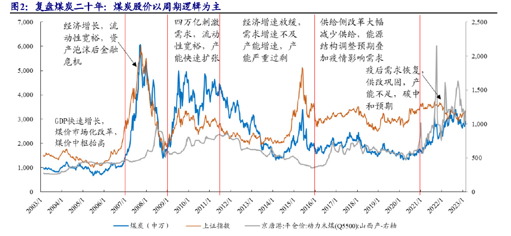 从 2003 年到 2022 年的二十年间,煤炭行业指数可以分为 6 个主要阶段,除流 动性因素外,影响煤炭指数的主要因素为煤炭价格,煤价驱动股价,股价跟随煤价, 而总需求和总供给决定煤炭价格,煤炭指数以周期逻辑为主。 2003-2006 年:我国 GDP 快速增长,能源消费快速提升,煤炭需求增长,煤价 市场化改革进一步提升煤价,煤价由 2003 年均价 264 元/吨上涨到 2006 年均价 427 元/吨,煤价中枢逐步抬高。煤炭指数由 2002 年年末的 876 点逐渐上涨到 2006 年年 末的 1263 点。 2007-2008 年:经济增长,需求继续抬升,受流动性宽裕影响,资产价格大幅 提升,资产泡沫后发生金融危机,股市出现大幅波动。煤价由 2007 年初的 460 元/ 吨,上涨到 2008 年 7 月的 995 元/吨,后又在 12 月回调到 510 元/吨。煤炭指数亦由 2007 年初的 1263 点,上涨到 2007 年 10 月的 6062 点,后又大幅回调到 2008 年 10 月的 1375 点。