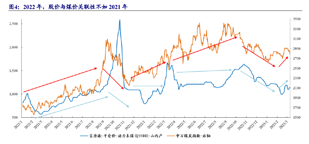 2022 年,煤炭行业周期属性弱化。2022 年 2 月底,国家发改委发布《关于进 一步完善煤炭市场价格形成机制的通知》,明确了电煤中长期合同价格合理区间, 确立了电煤中长期合同价格形成机制,通知自 2022 年 5 月 1 日起执行。2022 年 7 月,国家发改委进一步要求电煤中长期合同严格落实三个 100%(签约率、履约率、 价格政策执行),同时,对电煤现货交易价格设置价格上限。2022 年,电煤长协价 格维持在 720 元/吨附近,电煤港口限价 1155 元/吨。2022 年,在限价政策下,能源 需求仍具韧性,俄乌冲突加速全球能源供需错配,煤价高位震荡。随着电煤中长期 合同的签约执行,长协签约率不断提升,现货煤价波动性明显减弱,股价与煤价关 联性亦减弱。从 2022 年股价与煤价走势图看,2021 年 12 月-2022 年 3 月,煤价走 势呈现“V”字型,而股价波动上涨,2022 年 4-9 月,煤价平缓波动,股价波动上行 并创年内新高,2022 年股价与煤价关联性明显不如 2021 年。电煤长协价格的相对 稳定以及长协签约率的提升,必将导致煤企盈利趋于稳定,煤炭行业周期属性趋于弱化。