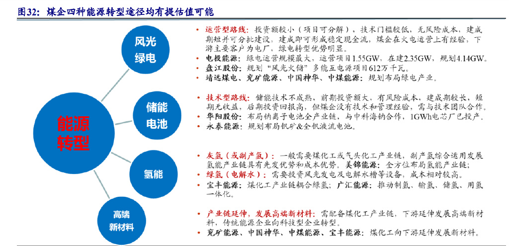 (1)风光绿电。风光绿电转型为运营型转型路线,是煤企能源转型的主要路 径之一,该路径具有投资额较小、项目可分解、技术门槛相对较低、风险成本低等 特点。风光绿电建成期短并可分批建设,建成即能形成稳定的现金流。由于大部分 煤企具有坑口火电厂,煤炭下游客户主要为电厂,煤企具有一定的电力运营能力, 风光绿电转型具有明显优势,是煤企转型初期的主要路径。电投能源:上市煤企中 风光绿电运营规模最大,运营项目 1.55GW,在建 2.35GW,规划 4.14GW。盘江股 份:规划发展风电、光伏、火电、抽水蓄能项目 612 万千瓦,“风光火储”多能互补, 前景广阔。靖远煤电、兖矿能源、中国神华、中煤能源:规划布局绿电产业。
