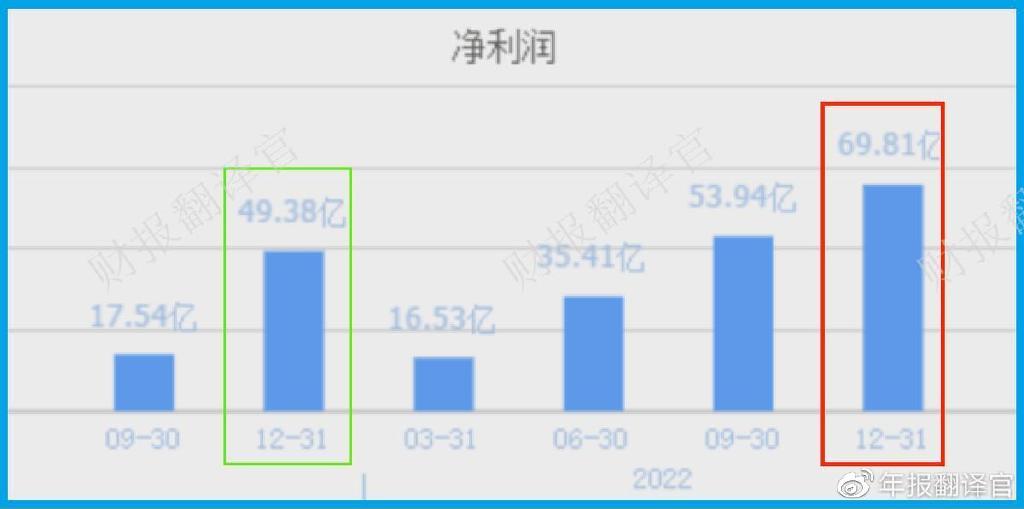 2021年第四季度,这家公司的净利润只有49.38亿元。到了2022年第四季度,该企业的净利润就达到了69.81亿元,同比增长了41%。
