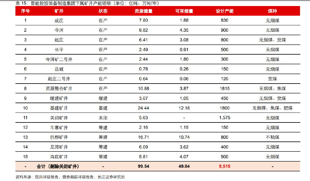 3)晋能控股装备制造集团:装备制造集团目前主营煤炭、煤化工、贸易三大业务板块, 其中煤炭产品自 2023 年 1 月 1 日起通过晋能控股 对外销售, 2021 年煤炭业 务毛利润占比接近 60%。装备制造集团煤炭业务所处晋东矿区(包括阳泉矿区、晋城矿 区)是全国无烟煤储量最集中的地区,占山西省无烟煤储量的 65%、占全国无烟煤储量 的 26%。截至 2021 年末,装备制造集团拥有 59 座矿井,资源储量合计 105.17 亿吨, 设计生产能力为 11,090 万吨/年,剔除已关闭矿井生产能力为 9515 万吨/年。