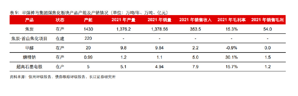 截至 2022 年 3 月末,平煤神马集团拥有煤炭备案资源量 20.13 亿吨,剩余可采储量 9.74 亿吨,在产矿井核定产能 3,618 万吨/年,在建矿井核定产能 270 万吨/年,其中夏 店矿项目已于 2023 年 2 月 9 日至 10 日通过竣工验收。除此之外,集团煤焦化板块子 公司主要包括首山焦化、中鸿焦化、京宝焦化和朝川焦化,产品主要包括焦炭、甲醇、 氢、苯、硅烷气以及其他深加工所产的附属产品等,2021 年集团焦炭产能 1,430 万吨/ 年,煤焦油深加工能力 30 万吨/年,甲醇设计产能 20 万吨/年,糖精钠设计产能 0.99 万 吨/年,超高石墨电极产能 5 万吨/年。 根据 2022 年 10 月集团出具的《关于解决同业竞争的承诺函》,夏店矿及梁北二井投产 后均将择机注入上市公司,在满足条件的情况下平顶山市瑞平煤电有限公司的全部股权 或张村矿、庇山矿相关资产也将转让给上市公司或其子公司,首山化工、京宝化工、中 鸿煤化及其他下属焦化企业(如有)的全部股权或焦化业务相关资产也将择机转让给上 市公司或其子公司。