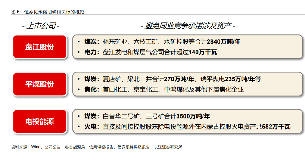 根据贵州能源集团 2021 年 6 月作出的《避免同业竞争承诺函》,集团承诺将满足资产证 券化条件的煤炭业务和发电业务通过股权转让、资产出售或其他合法方式注入盘江股份, 其中集团控制的主营煤炭业务公司包括松河煤业、林东矿业、六枝工矿、中城能源等, 在产及拟在建产能合计超过 1000 万吨/年,发电业务公司包括盘江发电和煤层气公司, 现有装机规模超过 140 万千瓦。除此之外,根据贵州省人民政府及贵州省国资委相关批 复要求,贵州省国资委将贵州水矿控股集团有限责任公司(以下简称“水矿控股”)委托 贵州能源集团管理,并将在水矿控股债转股完成后将其所持水矿控股股权划转给集团, 集团同样承诺在前述股权划转完成后五年内将满足资产证券化条件的煤矿业务资产通 过股权转让、资产出售或其他合法方式,注入盘江股份;水矿控股目前在产及拟在建煤 炭产能合计超过 2000 万吨/年。
