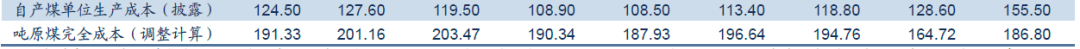 资料来源:中国神华年报,信达证券研发中心整理根据年报披露数据测算,2019-2021年,中国神华所属煤矿自产煤单位生产成本为118.80、128.60、155.50元/吨,吨煤完全成本为194.76、164.72、186.80元/吨。