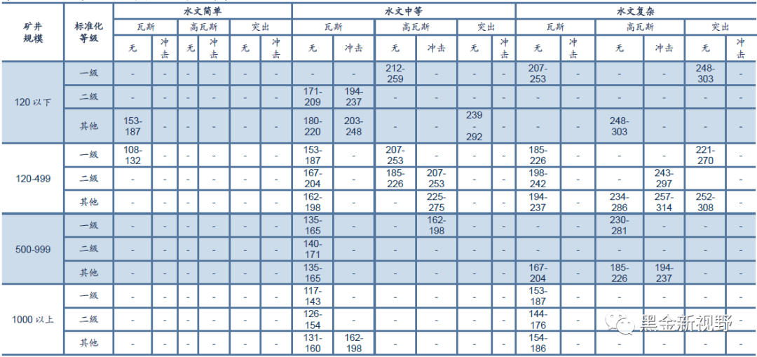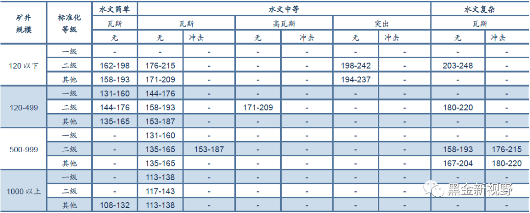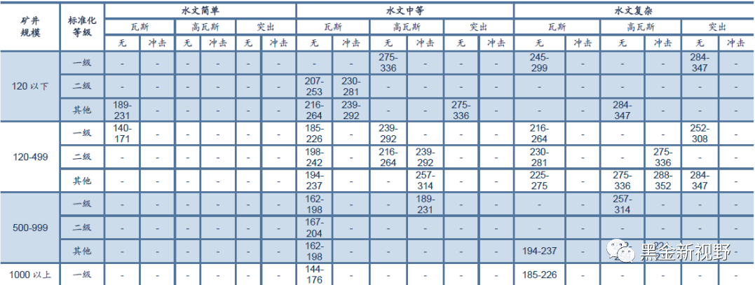 根据划分的煤矿产能分布区间,井工煤矿主要集中在水文地质条件中等的瓦斯和高瓦斯区间(详见表11)。综合依据上市企业公告数据和样本煤矿的成本数据,结合山西地区高瓦斯矿井、突出矿井和水文复杂矿井的灾害防治费用,测算山西省井工煤矿的原煤营业成本为113-429元/吨(详见表12),露天矿营业成本为95-115元/吨。同时,结合现有煤矿的三费占营业成本的比例情况,综合估算120万吨/年以下、120-499万吨/年、500-999万吨/年和1000万吨/年以上不同矿井规模下的三费为81-99、63-77、45-55、27-33元/吨。