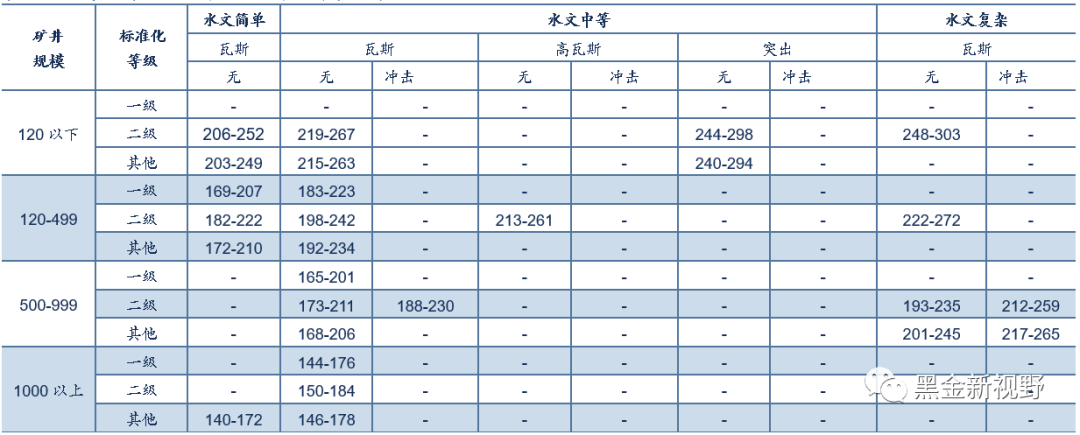 煤炭资源网样本煤矿数据。根据中国煤炭资源网提供的样本煤矿,矿井规模分别包含180-300、500-1000、1300、1500万吨/年,样本煤矿的原煤生产成本为104.86-265.44元/吨,原煤完全成本为131.30-305.56元/吨。