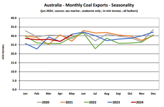 2020-2024年澳大利亚煤炭出口月度变化走势
