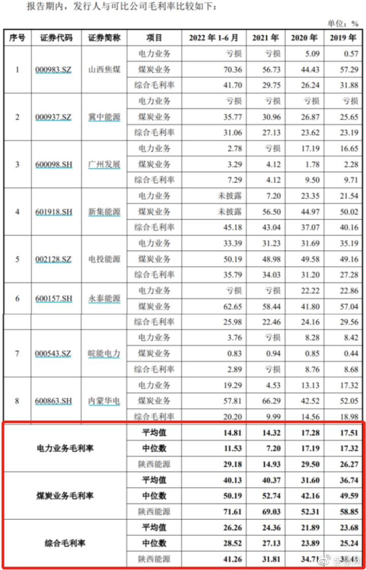 招股数据显示,在对比山西焦煤、翼中能源在内的共计8家可比公司上市毛利率中,陕西能源2019-2021年及2022上半年电力业务毛利率分别为26.27%、29.5%、14.93%、29.18%,均大幅高于均值水平的17.51%、17.28%、14.32%、14.81%;同时,陕西能源煤炭业务毛利率各期分别为58.85%、52.31%、69.03%、71.61%,位列可比公司第一位,大幅高于均值的36.74%、31.6%、40.37%、40.13%,两大核心业务共同推动公司综合毛利率分别达到38.41%、34.71%、31.81%、41.26%,拉开均值水平23.68%、21.89%、24.36%、26.26%数个身位。