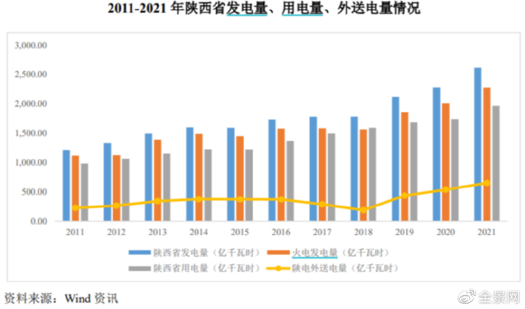 并且,陕西省煤炭储量全国第三,是国家重要的能源基地,是西电东送的战略要地,西电东送为陕西煤电企业提供较好的发展机遇。目前陕西省外送电量持续增长,外送电量由2011年的226.79亿千瓦时增长至2020年的537.30亿千瓦时,年复合增长率为10.06%;2021年达到649.80亿千瓦时,同比增长20.94%。陕西省外送电量整体呈现增长的态势。