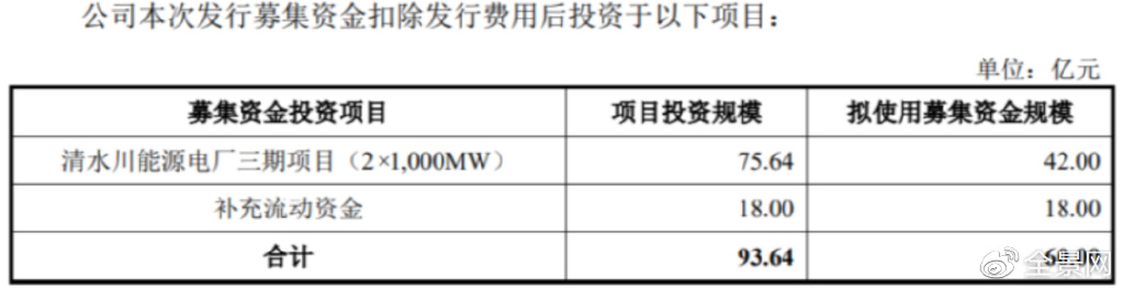 该资金会投入总投资规模达75.64亿元的清水川能源电厂三期项目(2×1000MW),剩余则用于补充流动资金。