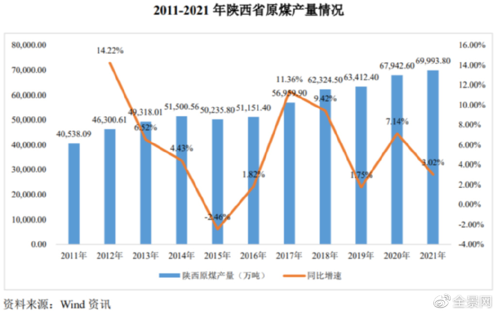 2021年,陕西省原煤产量7.00亿吨,创历史新高,同比增长3.02%,拉动全国原煤产量提高0.5个百分点,占全国总产量的比重为17.19%,2021年全省煤炭消费量同比增长0.50%;2022年1-6月,陕西省原煤产量3.66亿吨,同比增长7.49%。2011年以来,陕西省煤炭产量增长速度均高于全国平均水平,陕西省在全国煤炭保障方面的地位不断凸显。像陕西能源这样拥有陕西省丰富煤炭资源和产能规模优势的企业,将持续受益。