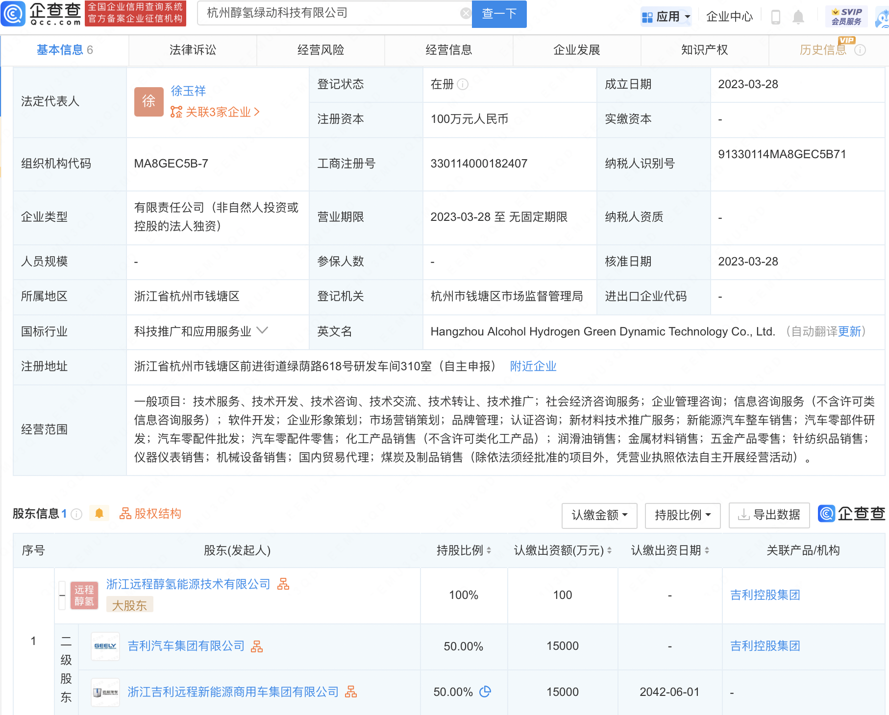 企查查APP显示,近日,杭州醇氢绿动科技有限公司成立,法定代表人为徐玉祥,注册资本100万元人民币,经营范围包含:新能源汽车整车销售;汽车零部件研发;金属材料销售;煤炭及制品销售等。企查查股权穿透显示,该公司由吉利旗下浙江远程醇氢能源技术有限公司全资持股。