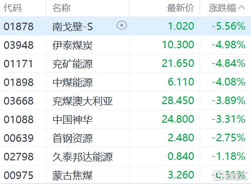 港股的煤炭股也跟随走弱。南戈壁跌逾5%,伊泰煤炭、兖矿能源、中煤能源跌逾4%。