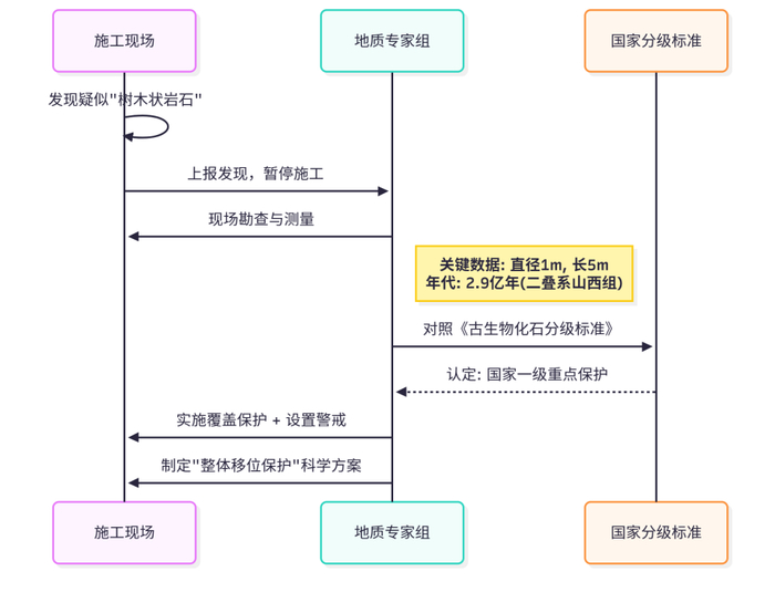 图解说明:此图展示了从发现到定级的标准化科学流程。重点在于专家介入后的科学鉴定(年代、尺寸)与法律定级,以及最终采取的“移位保护”措施,体现了对珍贵地质遗产的严谨处置。