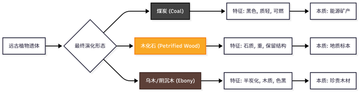 图解说明:通过这张对比图,可以清晰区分煤炭、木化石和乌木的演化终点与物理特征,帮助读者建立准确的分类认知。五、 结语