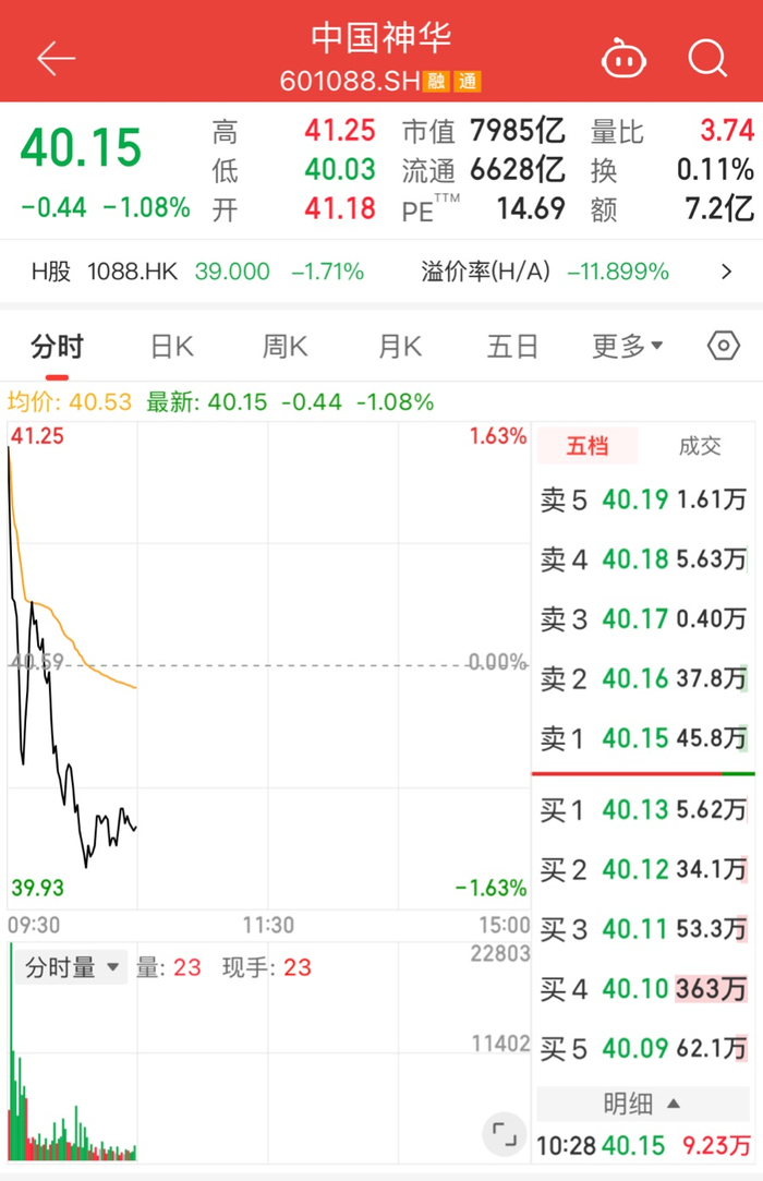 12月22日,A股煤炭龙头中国神华(601088.SH)股价呈现高开低走态势。开盘一度涨超1%,股价报41.18元/股,总市值突破8000亿元,但随后股价逐步走低。截至上午10:28,股价报40.15元/股,转为下跌1.05%,总市值随之回落至8000亿元以下。