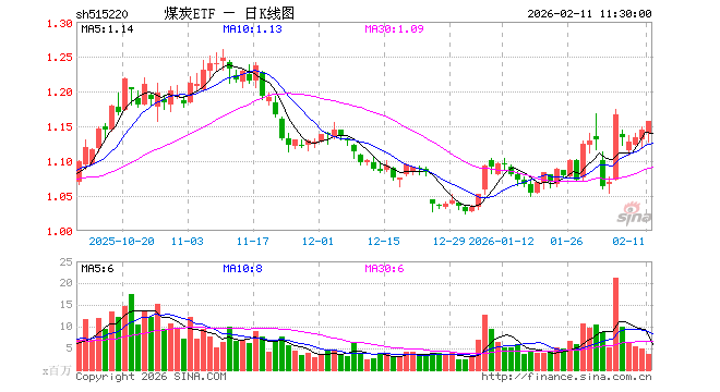 2月11日,截止午间收盘,煤炭ETF(515220)涨1.14%,报1.157元,成交额4.15亿元。煤炭ETF(515220)重仓股方面,中国神华截止午盘涨0.38%,陕西煤业涨0.74%,兖矿能源涨3.52%,中煤能源涨0.49%,山西焦煤涨1.29%,华阳股份涨2.23%,美锦能源涨0.20%,潞安环能涨2.27%,淮北矿业涨0.54%,平煤股份涨0.46%。